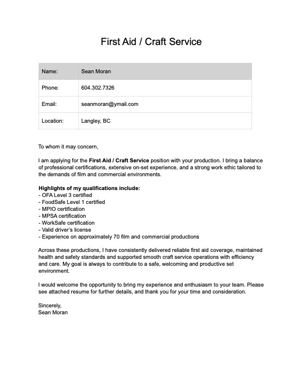 First Aid - Crucial role ensuring the safety and well-being for everyone on set. Trained medical professional responsible for providing immediate medical assistance and care that contributes to a safe and secure environment.